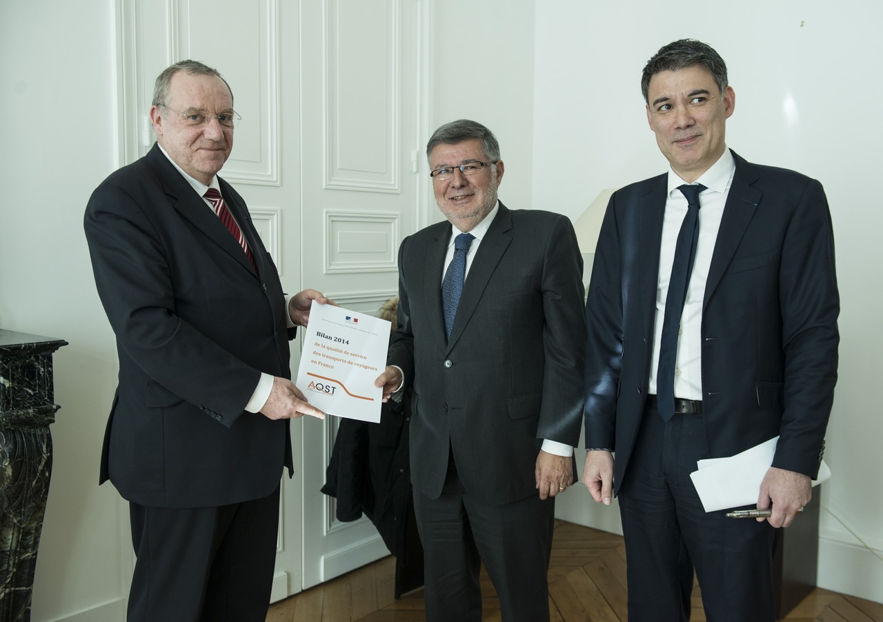Pascal Mignerey, directeur de l’Autorité de la qualité de service dans les transports (AQST) a remis ce bilan à Alain Vidalies, Secrétaire d’État chargé des Transports, de la mer et de la pêche, le 8 avril 2015, en présence d’Olivier Faure, député, président du Haut Comité de la qualité de service dans les transports. Le Secrétaire d’État a salué ce travail de synthèse et de transparence mettant à disposition du grand public les données sur la réalité de la qualité de service dans les transports de voyageurs en France.